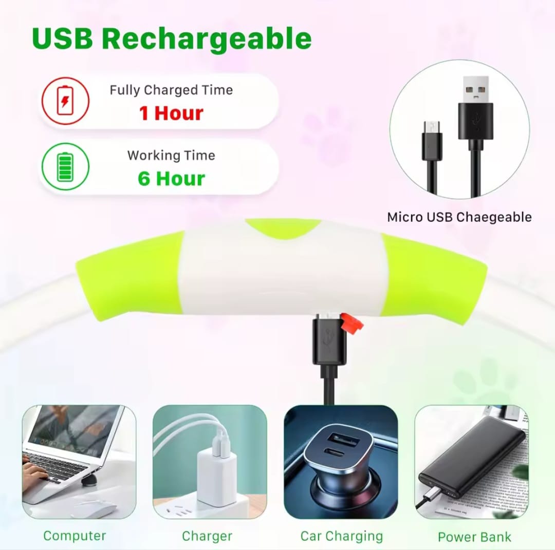 🌟 Con 3 modos de luz – fija, intermitente rápida y lenta – tu peludo siempre visible. 🚗💨Además es recargable por USB 🔋 y con hasta 9 horas de duración ⏳.