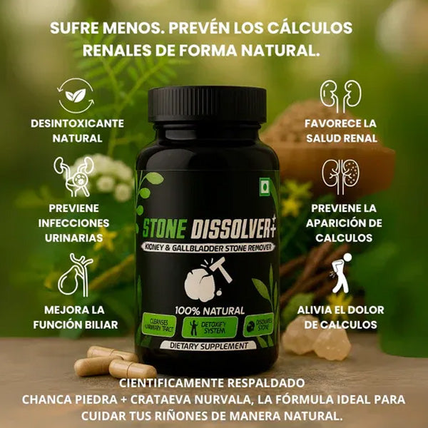 Stone Dissolver ha sido formulado con extractos naturales que favorecen la limpieza profunda del sistema renal y ayudan a mantener un equilibrio saludable, previniendo la formación de piedras en los riñones y la vesícula biliar. 🌿